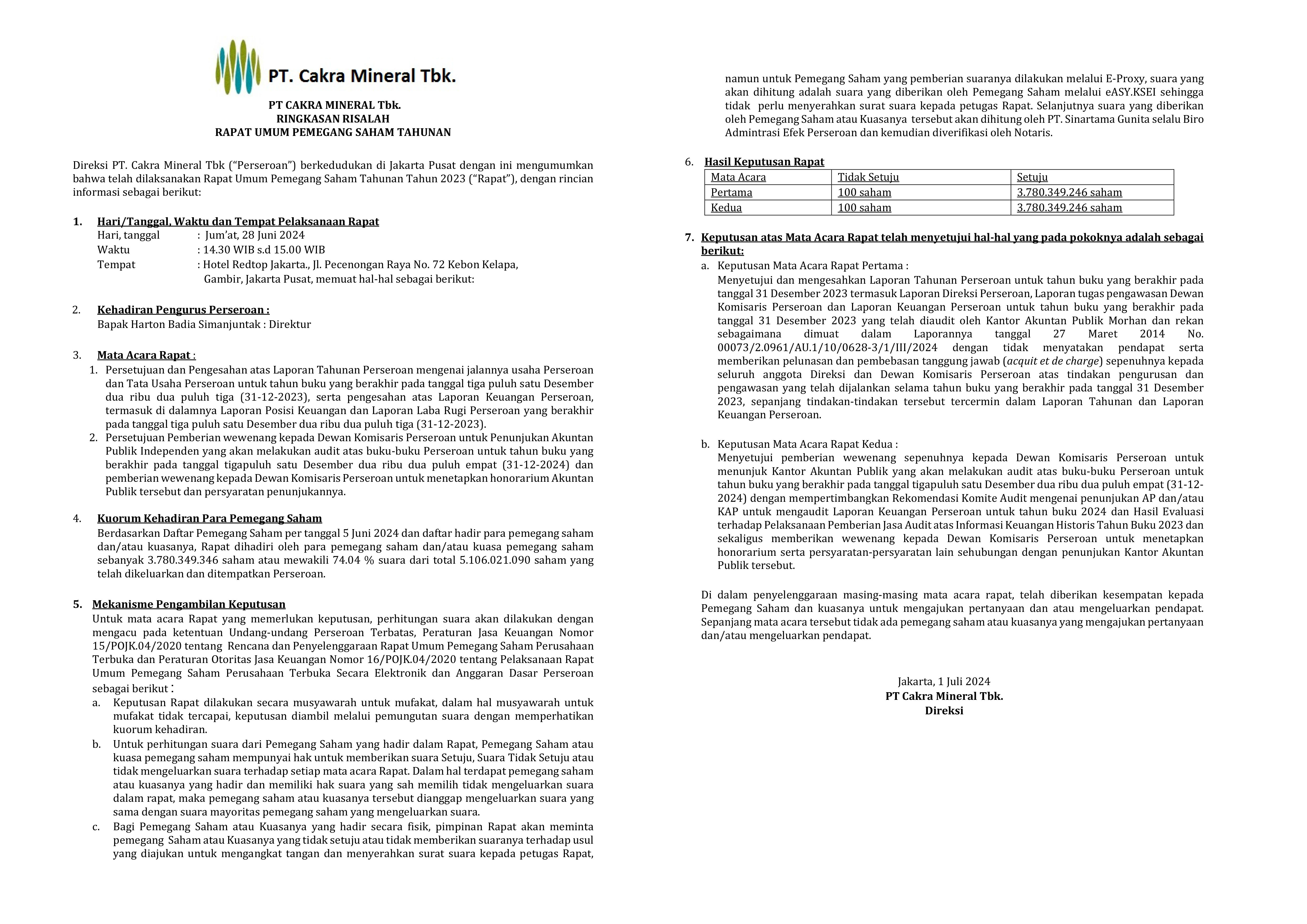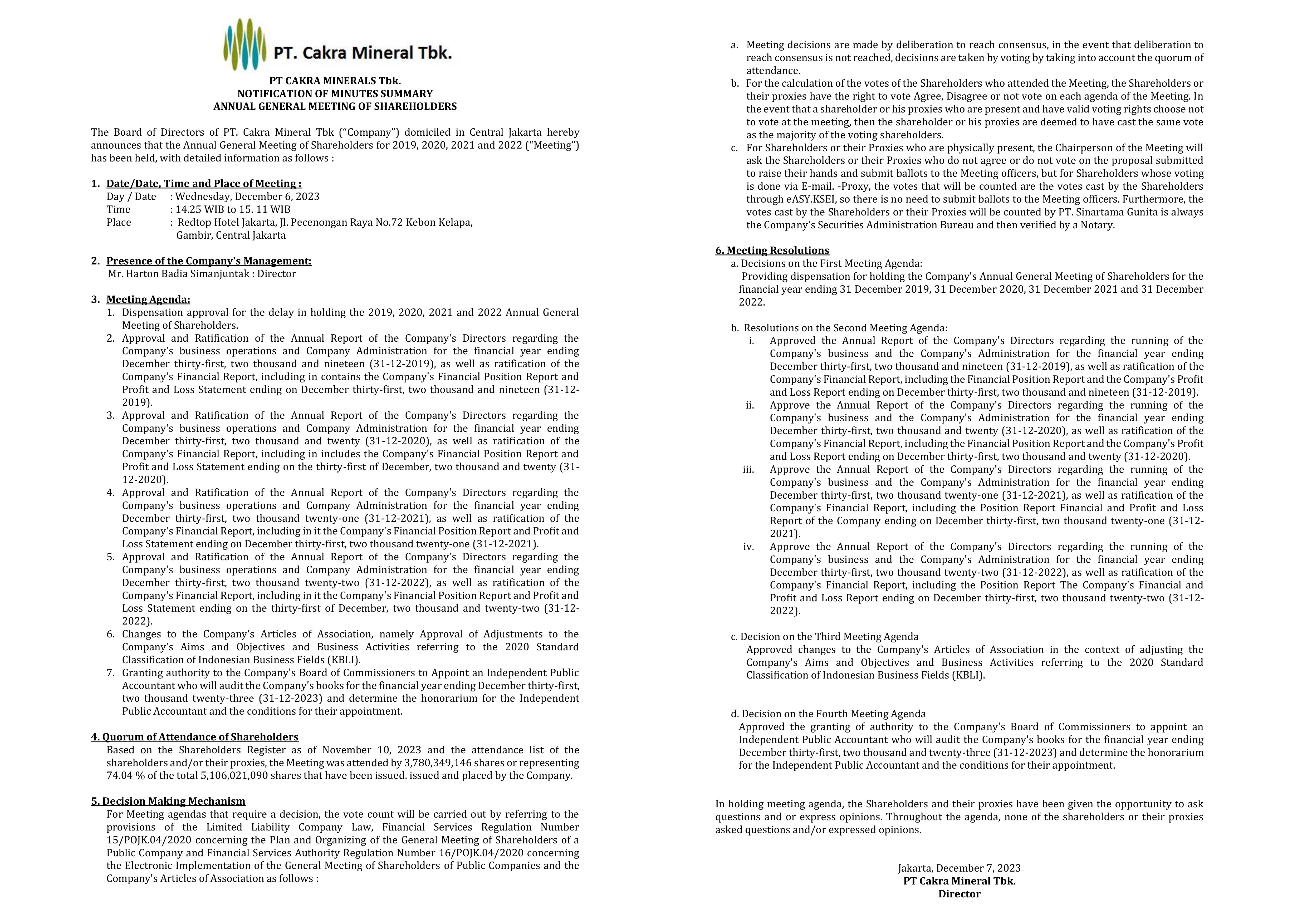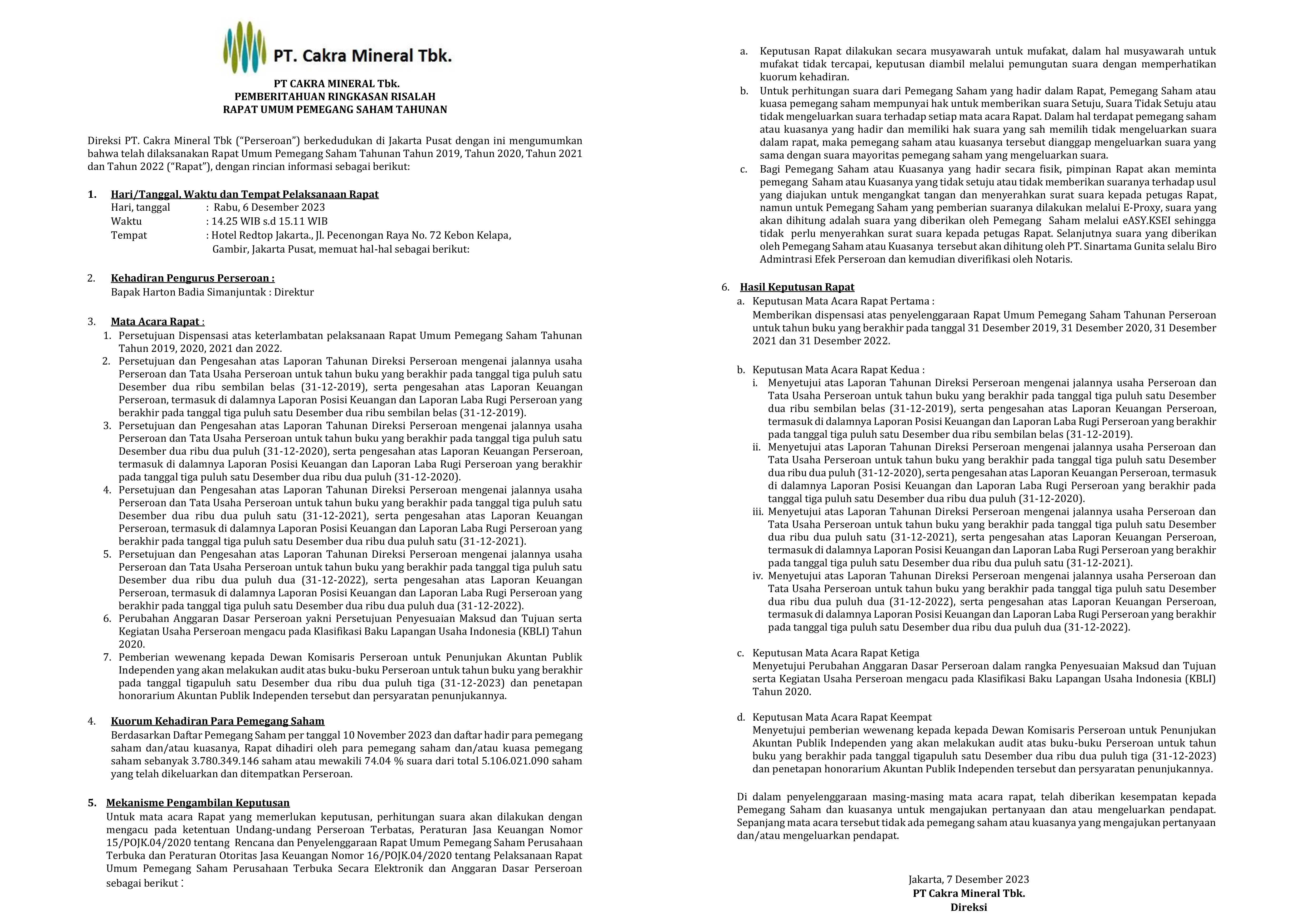 # ANNUAL REPORT 2024 PT. CAKRA MINERAL Tbk. # ANNUAL REPORT 2023 PT. CAKRA MINERAL Tbk. # Annual Report 2022 PT. Cakra Mineral Tbk # Annual Report 2021 PT. Cakra Mineral Tbk # Annual Report 2020 PT. Cakra Mineral Tbk # Annual Report 2019 PT. Cakra Mineral Tbk # Annual Report 2018 PT. Cakra Mineral Tbk # Annual Report 2013 PT. Cakra Mineral Tbk # Annual Report 2014 PT. Cakra Mineral Tbk