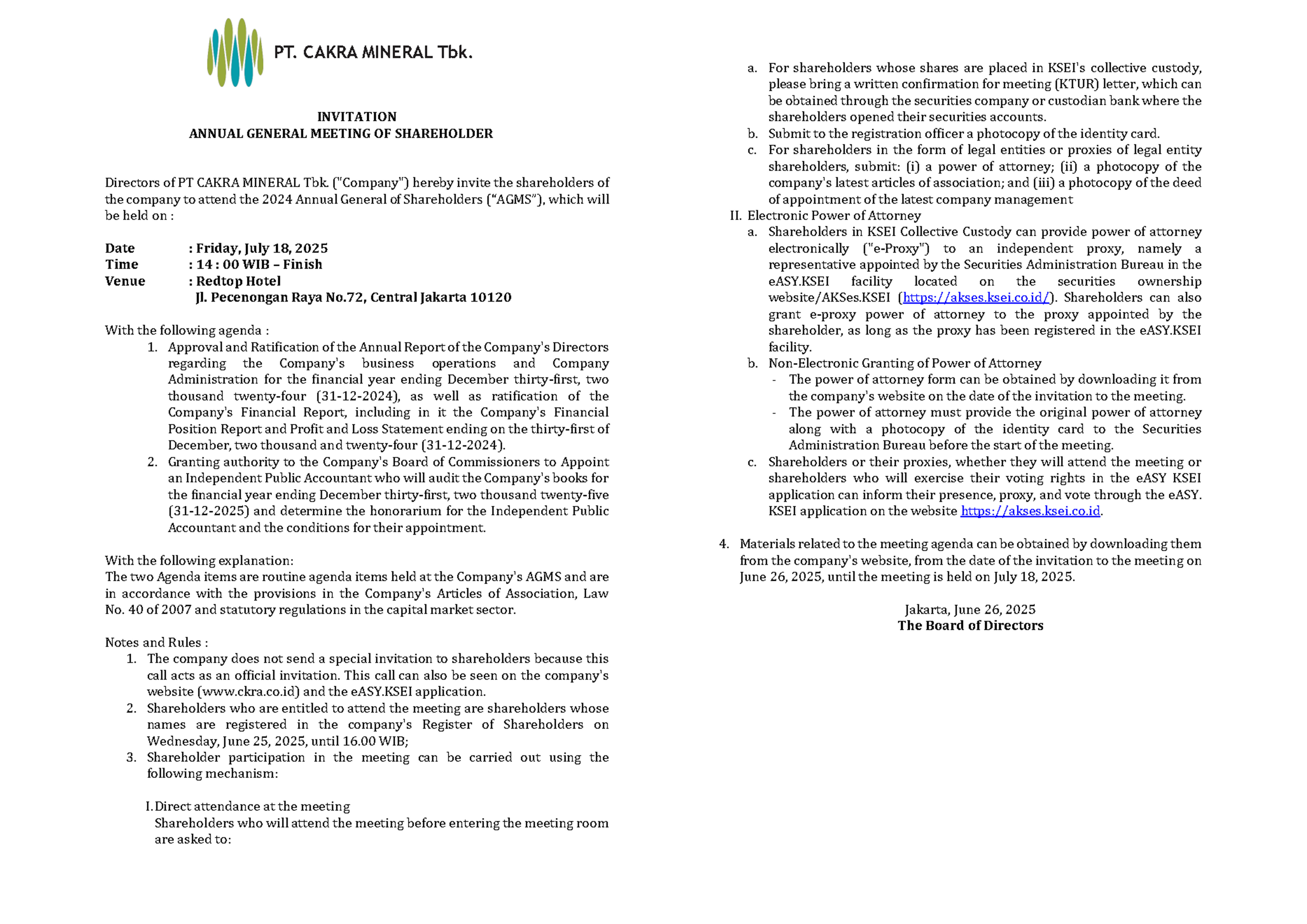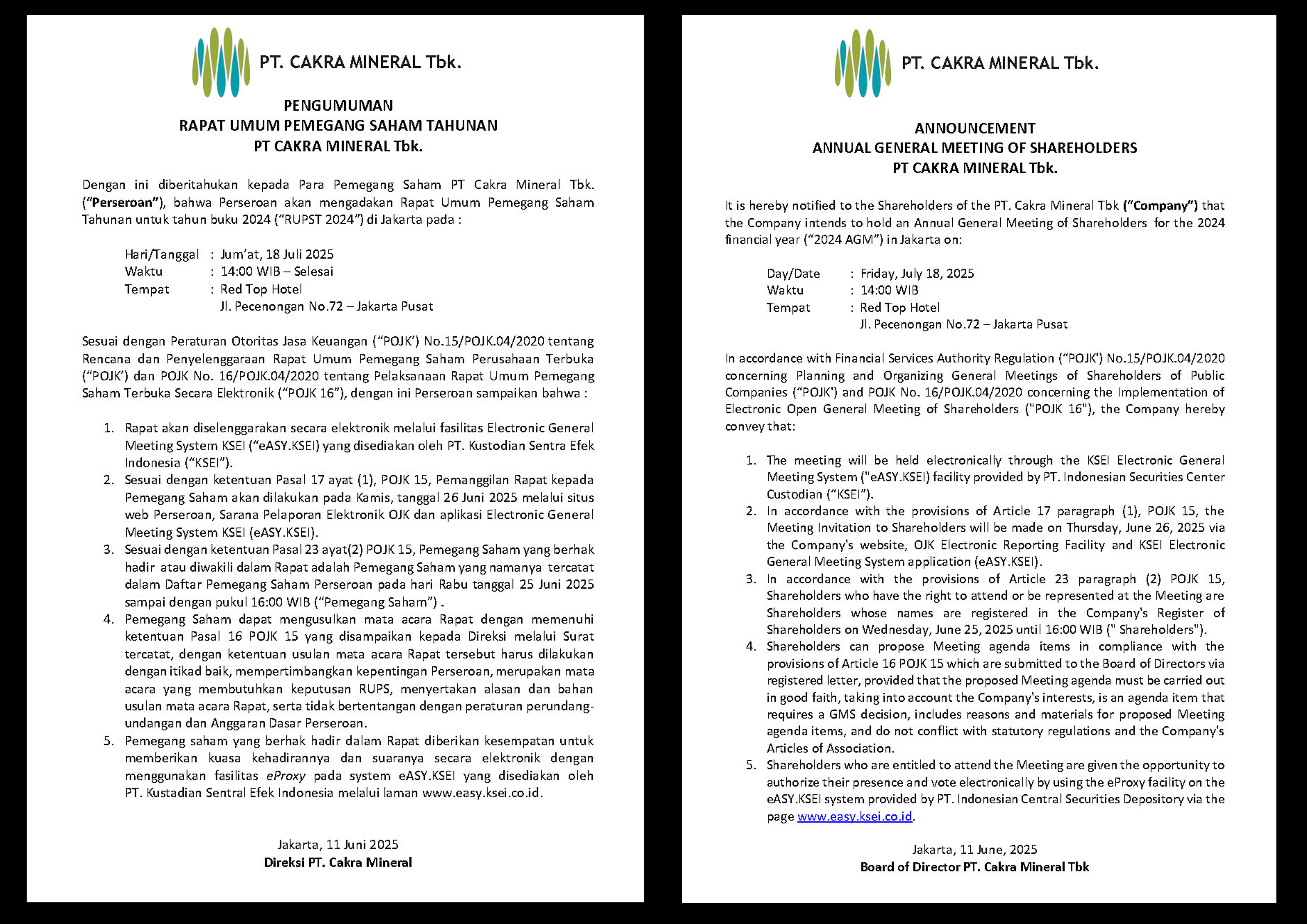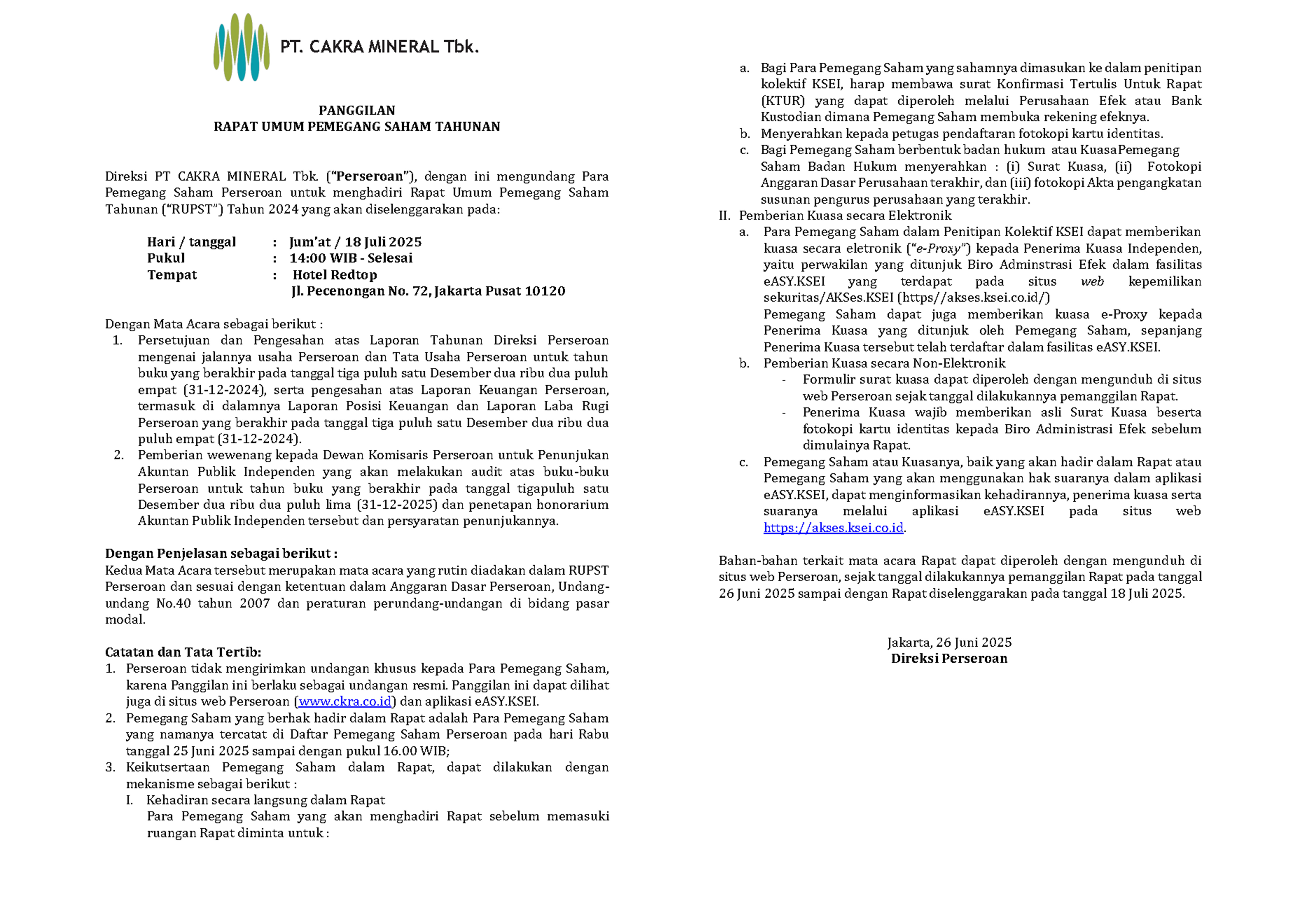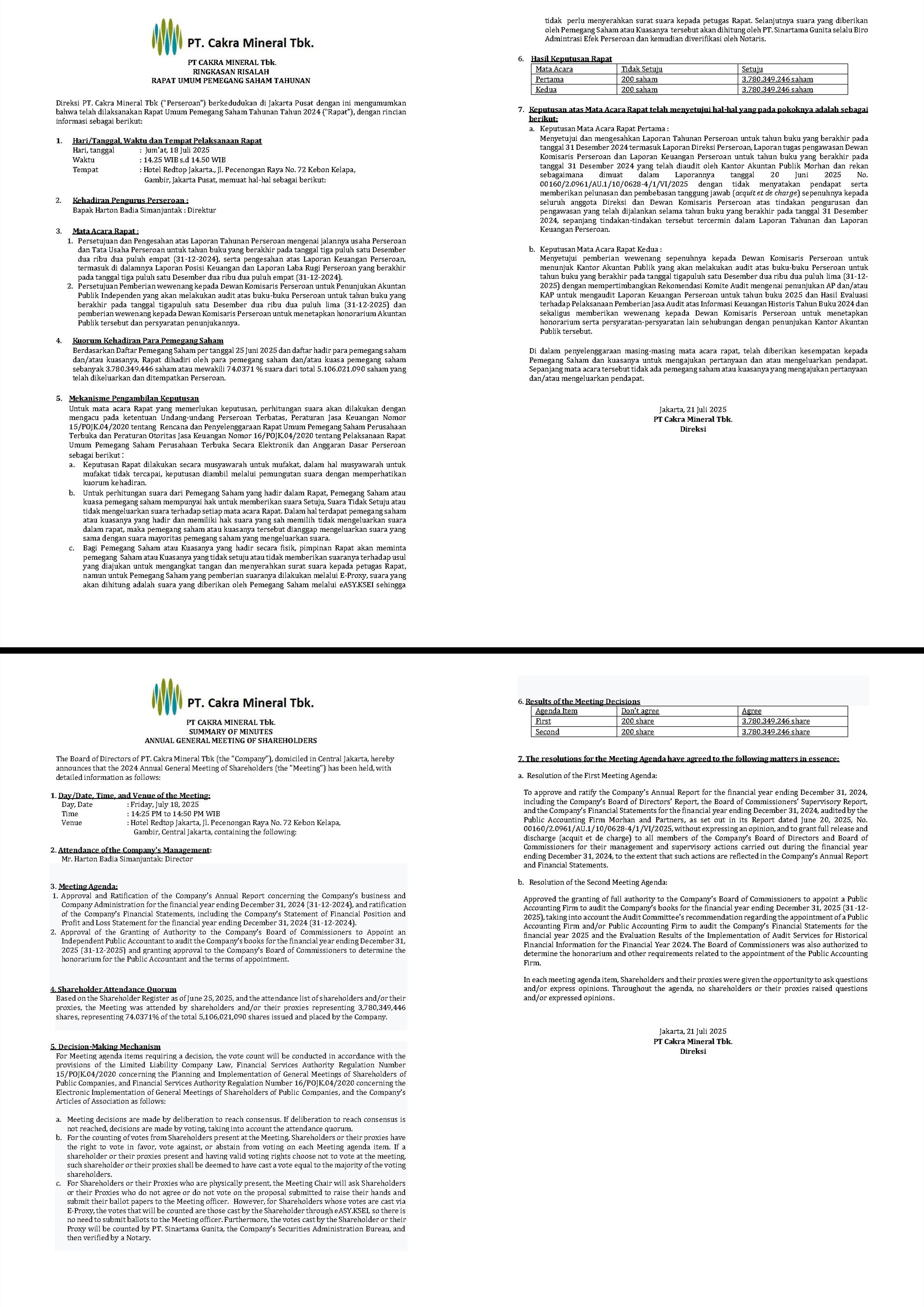 Ringkasan Risalah RUPST 2024 PT.CAKRA MINERAL Tbk.